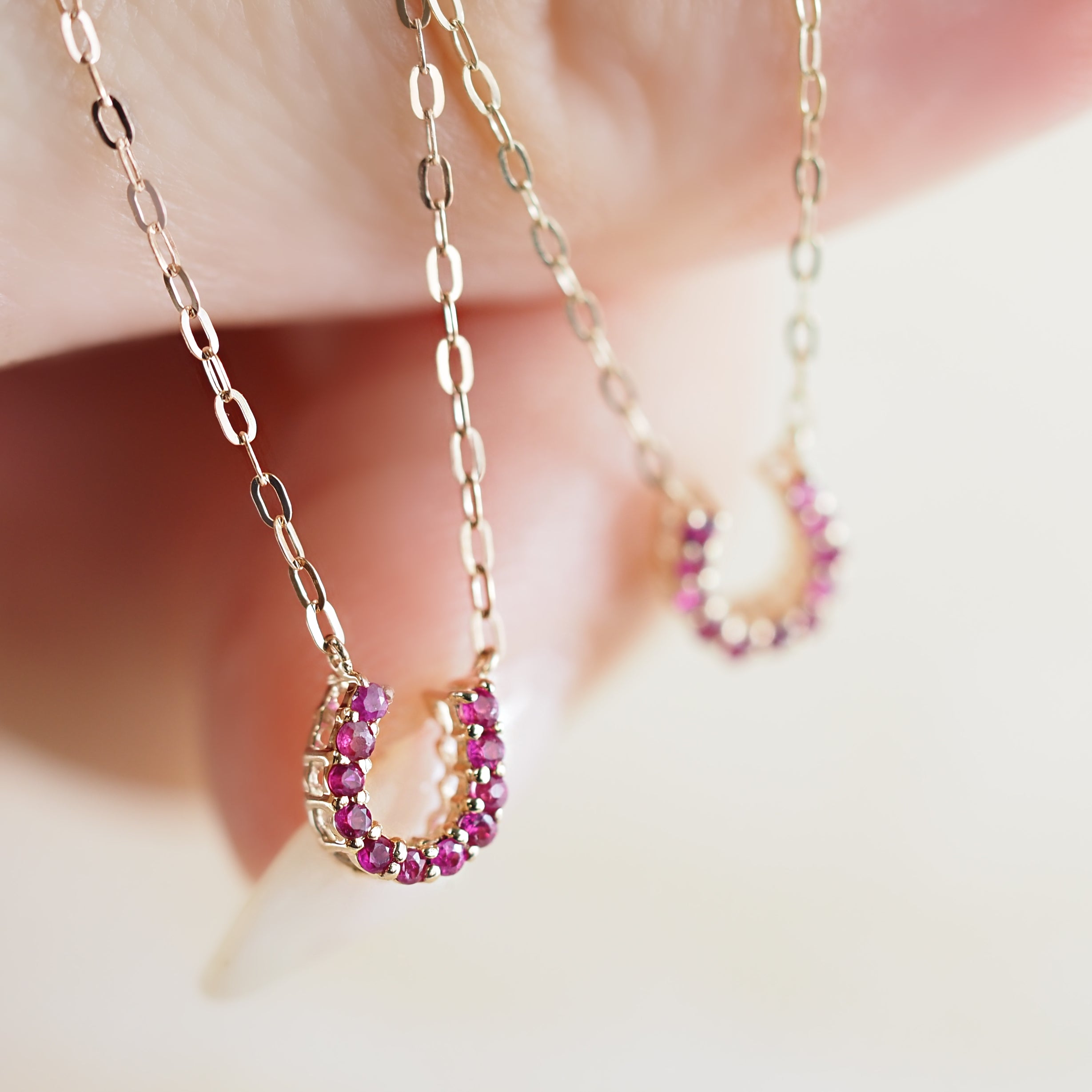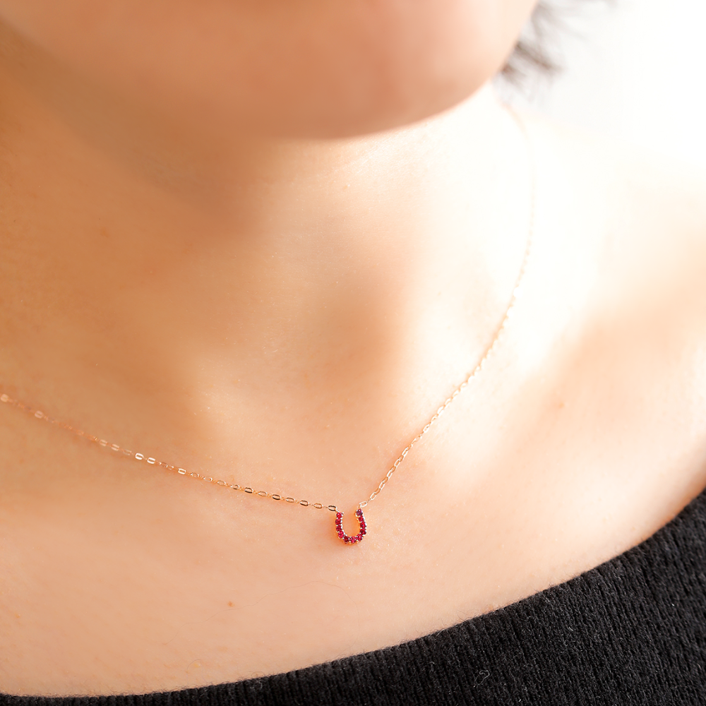 天然ルビーがセッティングされた、馬蹄モチーフのネックレス。